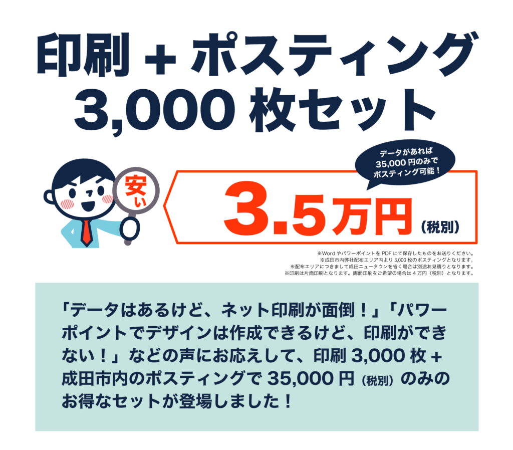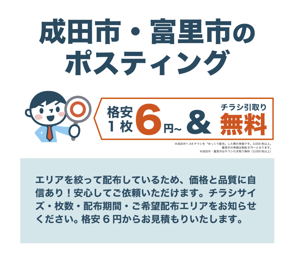 最小3,000枚から承ることができます。さらに、成田エリアのお客様のチラシ引き取りは無料となりますので、お気軽にご注文ください。